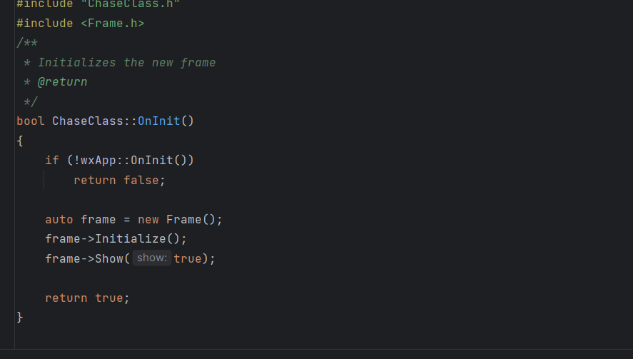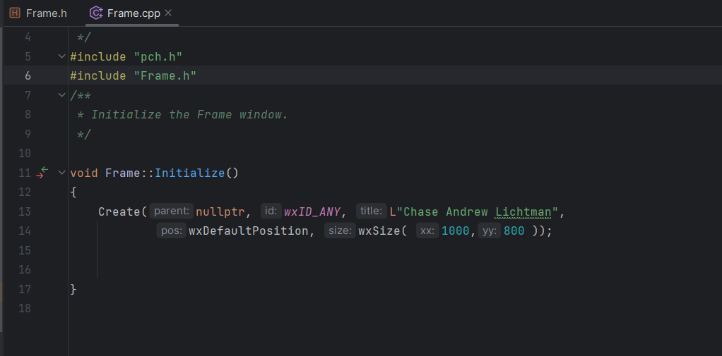 With a Frame class and an Initialize function made, we can now start making a new frame to try and make a popup window. The show function is apart of the wxWindows class from the library that lets us show the window.