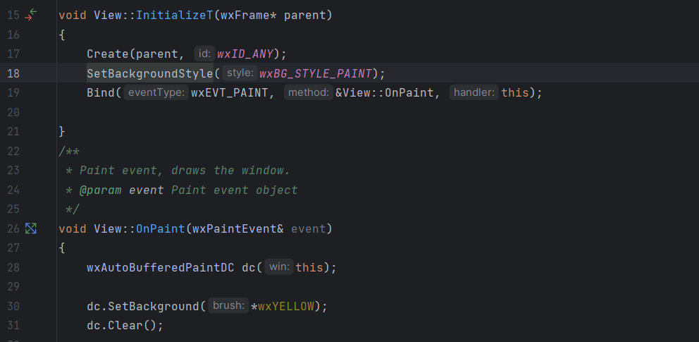 In this example I have made a new view class. Here we can initialize what we want to see on the screen and be able to paint and draw pictures. The bind function will then call our paint function. We can see that OnPaint has a parameter of a reference to a wxPaintEvent. We can see it is not being used in the function. This paint event is used for when a window's content needs to be changed or repainted. This may be a bit confusing, but we can see what in Bind all we have to do is &View::OnPaint. The paint event is just there to be like "Hey the window needs to be painted over again." The wxAutoBufferedPaintDC is a huge object. This will act as our canvas and make it so we can add things to the screen. We then ask it to set the background to yellow.
