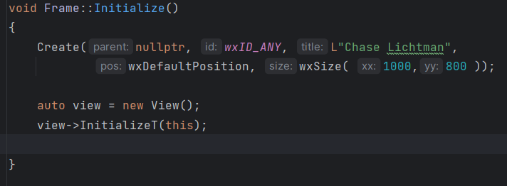 After declaring these functions, let's go back to our frame class and initialize our new view. After creating the frame let's make a new view object. We will then pass the frame that we just created into it and initialize the view with the InitializeT function we made in the view class. The "this" parameter for the InitializeT function just indicates that we are working with a pointer to the frame that is in the function.