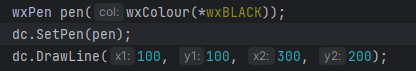 The last thing I want to show you is to draw something onto our background. With wxWidgets this is fairly simple. We just need to make a pen and set that pen to a color. Then we just need to call the Drawline function with the parameters of how long to make the line and where to place the line