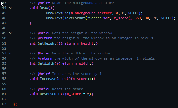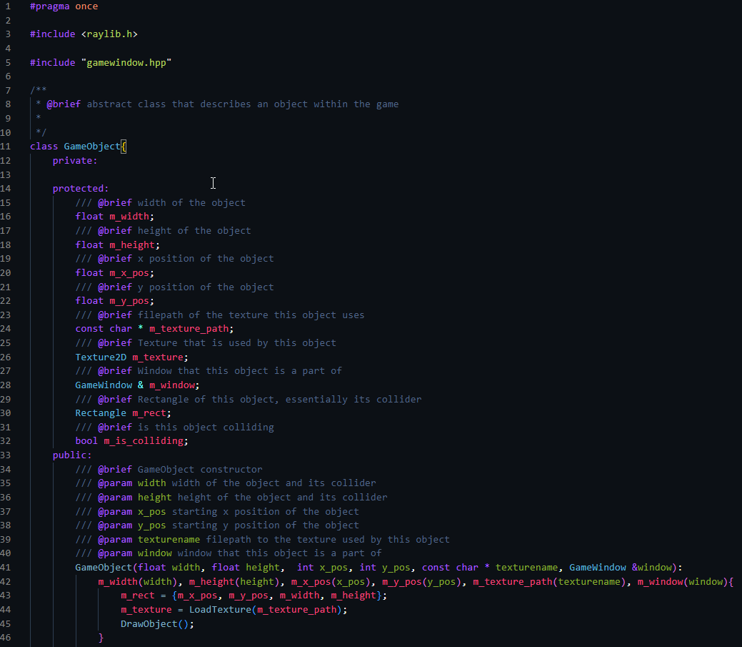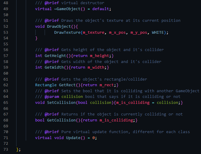 Afterwards, we can call DrawObject, which calls a Raylib C function that draws the texture at a x position and y position. Afterwards, we have various getters and setters for member variables of the class, followed by a pure virtual function, denoted by the "0" after the function declaration. The behavior within the Update function, which is called every frame, will be special for each object so we can make it a pure virtual function.