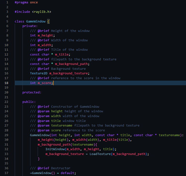 All member variables of the GameWindow other than the score will be passed in through the class constructor, initializing the object ready for use as shown on line 15 of the main function.