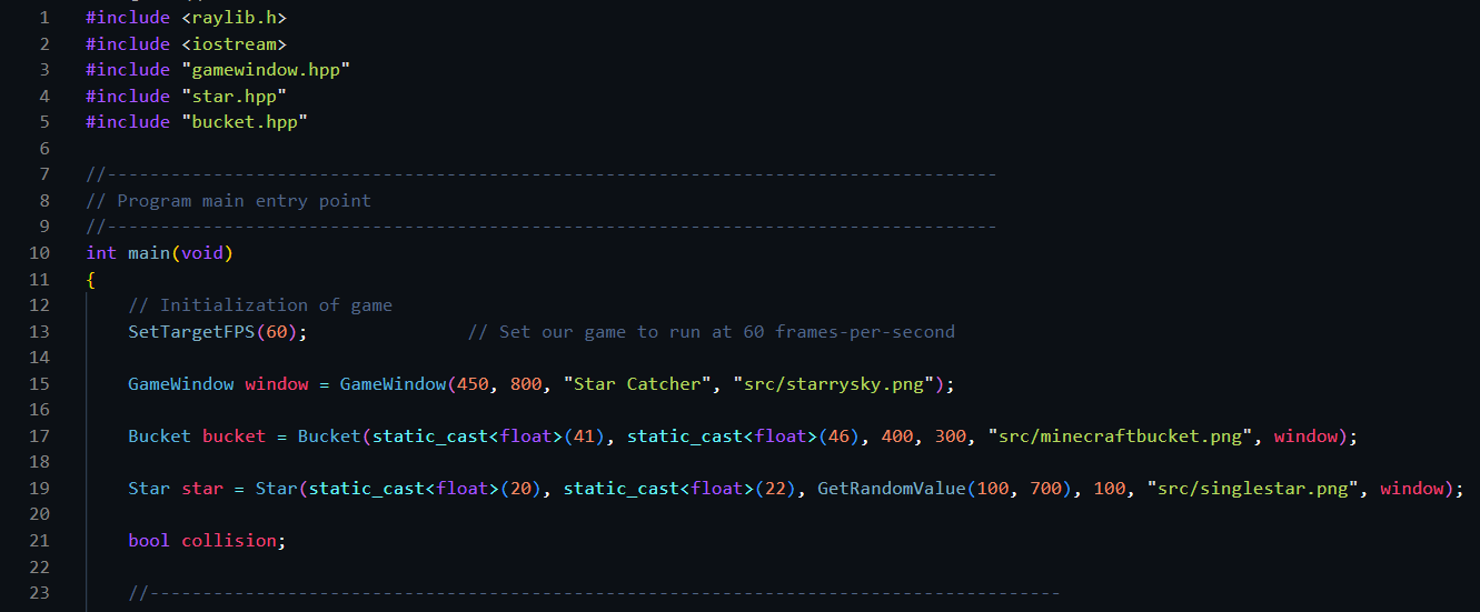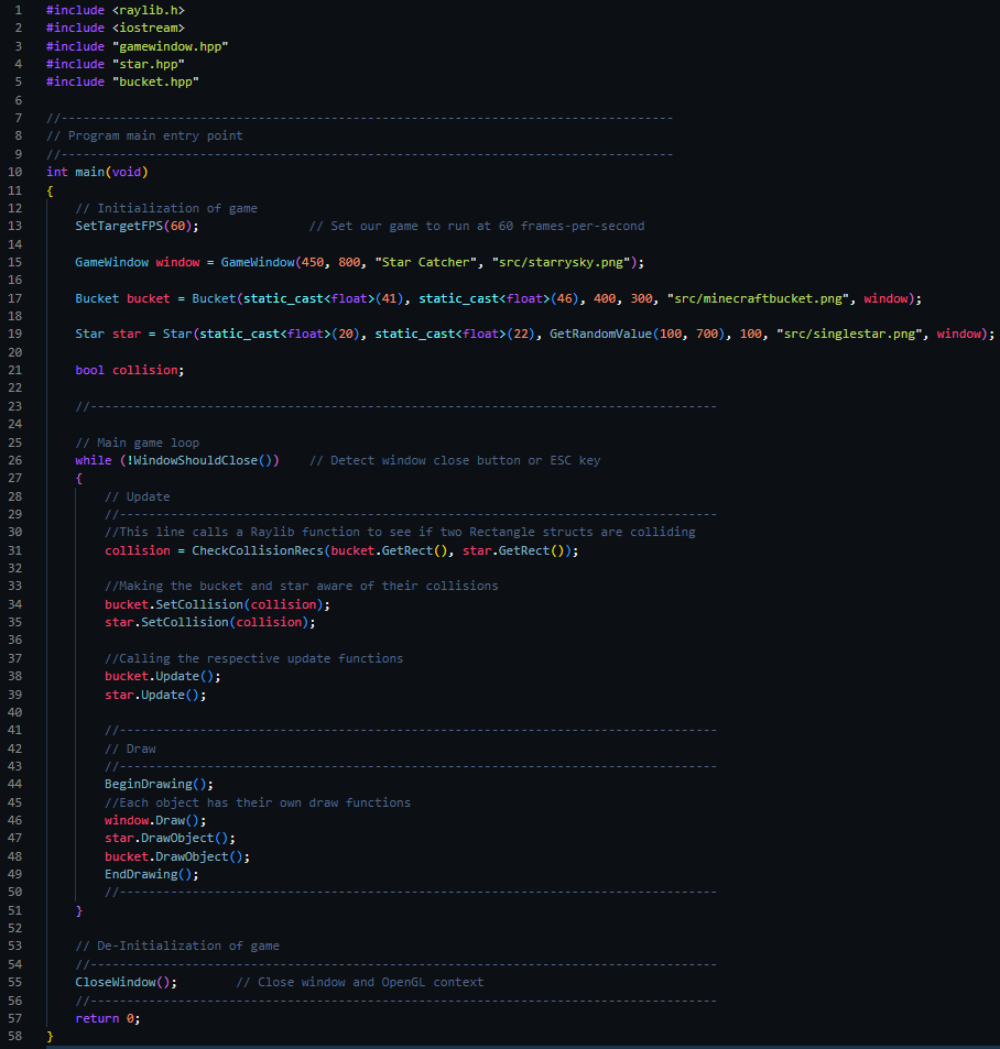 Here within the main function is the rest of the game loop. We begin by seeing if the star and bucket are colliding and tell both objects if they are colliding. Then, we call their respective update functions and draw the objects. In Raylib, we have to have any drawing done in between the BeginDrawing and EndDrawing functions.