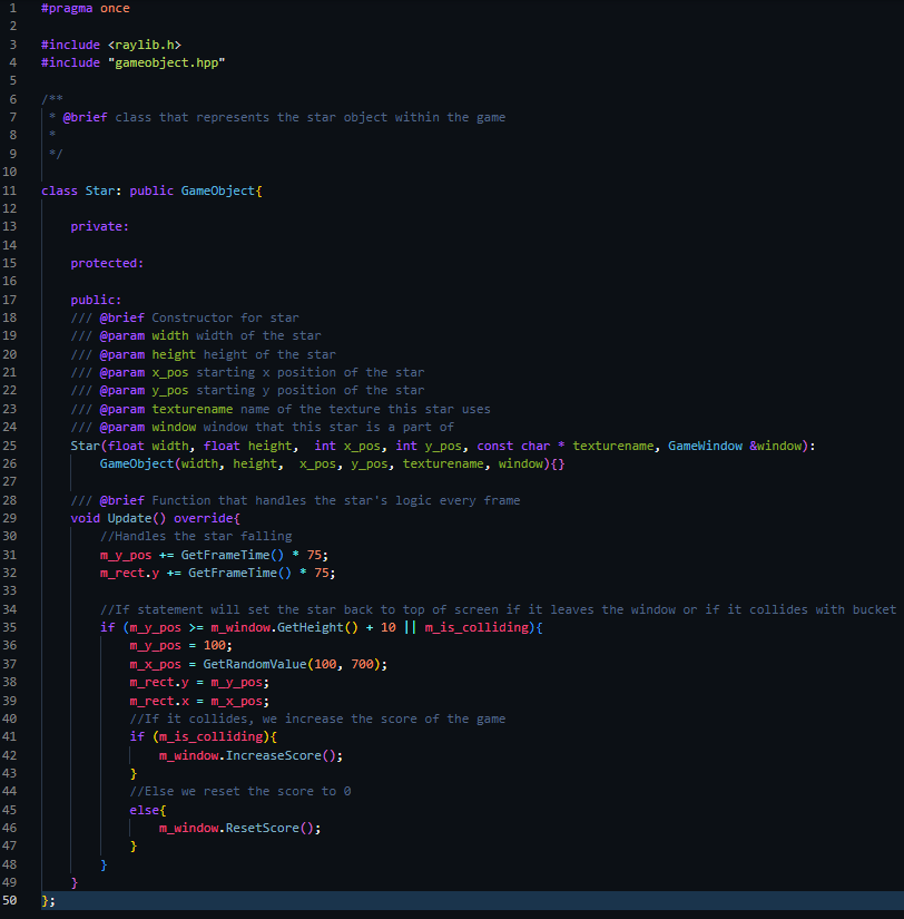 Just like Bucket, we are able to use an initializer list for the constructor and override the Update function. In this function, we have the star fall at a certain rate every frame. After that, we just check if the star is past the bottom of the screen, or if it is colliding with the bucket. If so, we reset the star's position, towards the top of the screen at a random x value within a certain range. If the star was reset by colliding, we call the increase score function from the window reference. If not, we reset the score entirely.