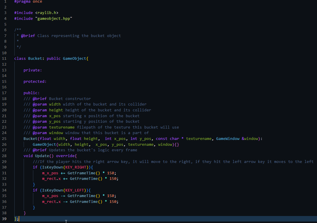 Other than the constructor, which is derived from the base class, we only need to implement our Update function specifically for the bucket. Essentially, we use Raylib functions to detect input from the keyboard, and depending on the key (left or right arrow key), we move the position of the object and its rectangle/collider to the left or right.