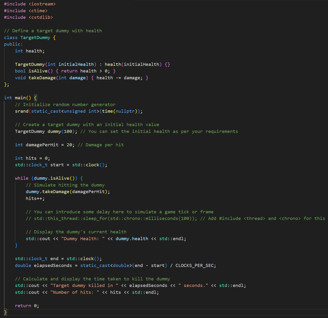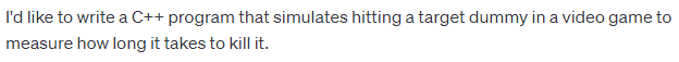 Pretty good! It creates a target dummy, hits it til it’s dead, and then reports the time it took to kill. There’s one slight problem though - \ it doesn’t compile. The line that initializes the random number generator has three left parentheses, and two right parentheses. ChatGPT was \ more than happy to correct its mistake, and then I asked it to calculate the time taken based on some arbitrary tick, instead of wall-clock \ time. And this is the relevant code: