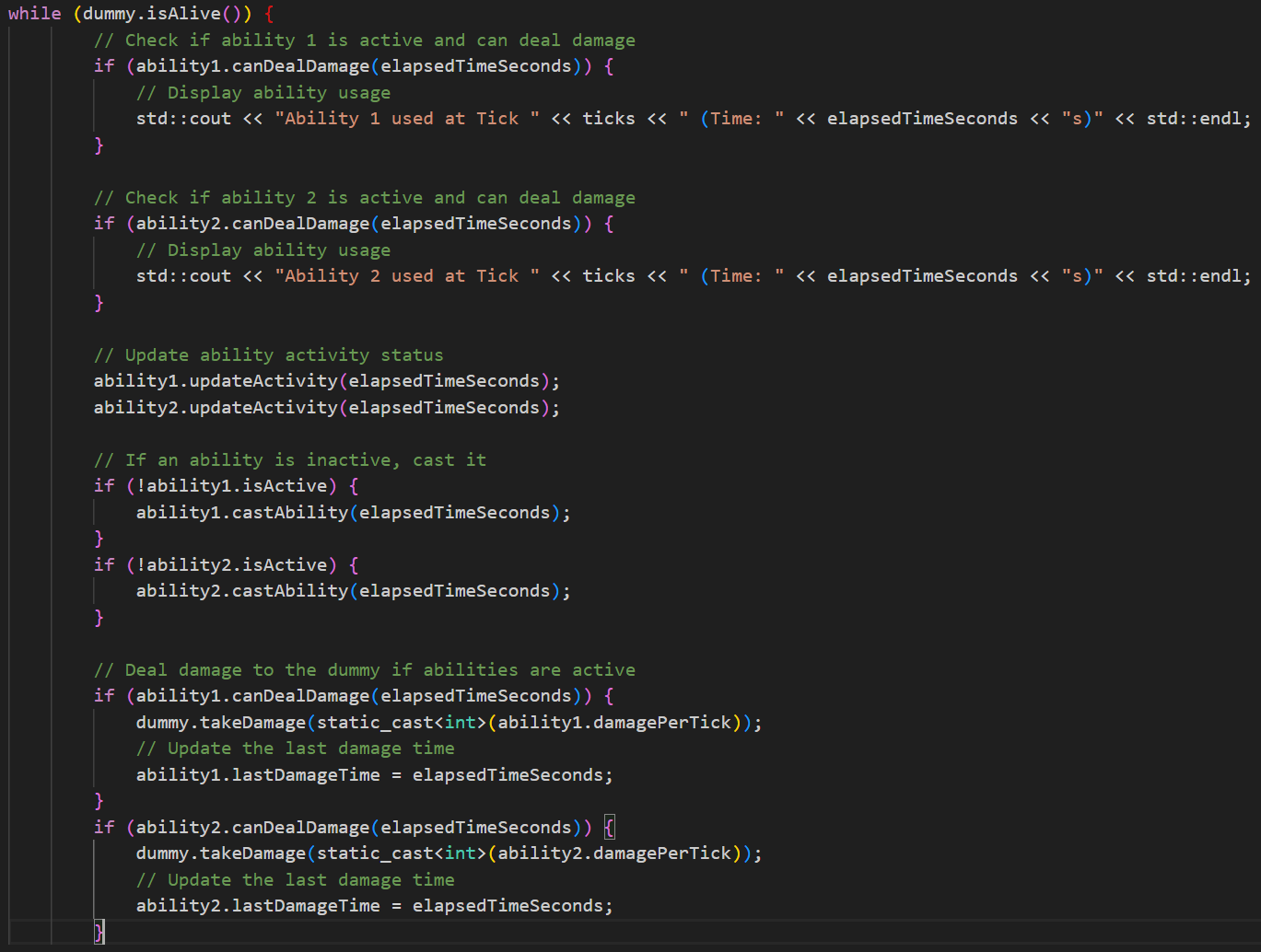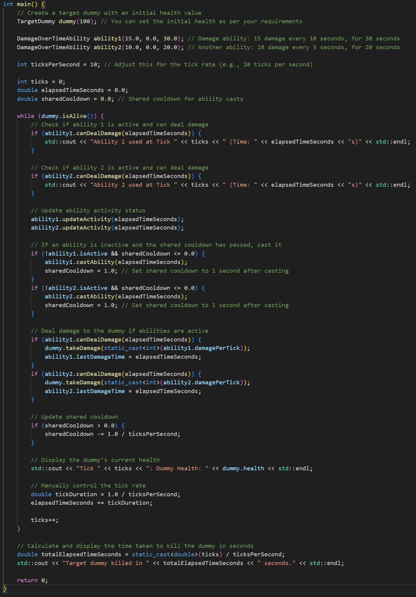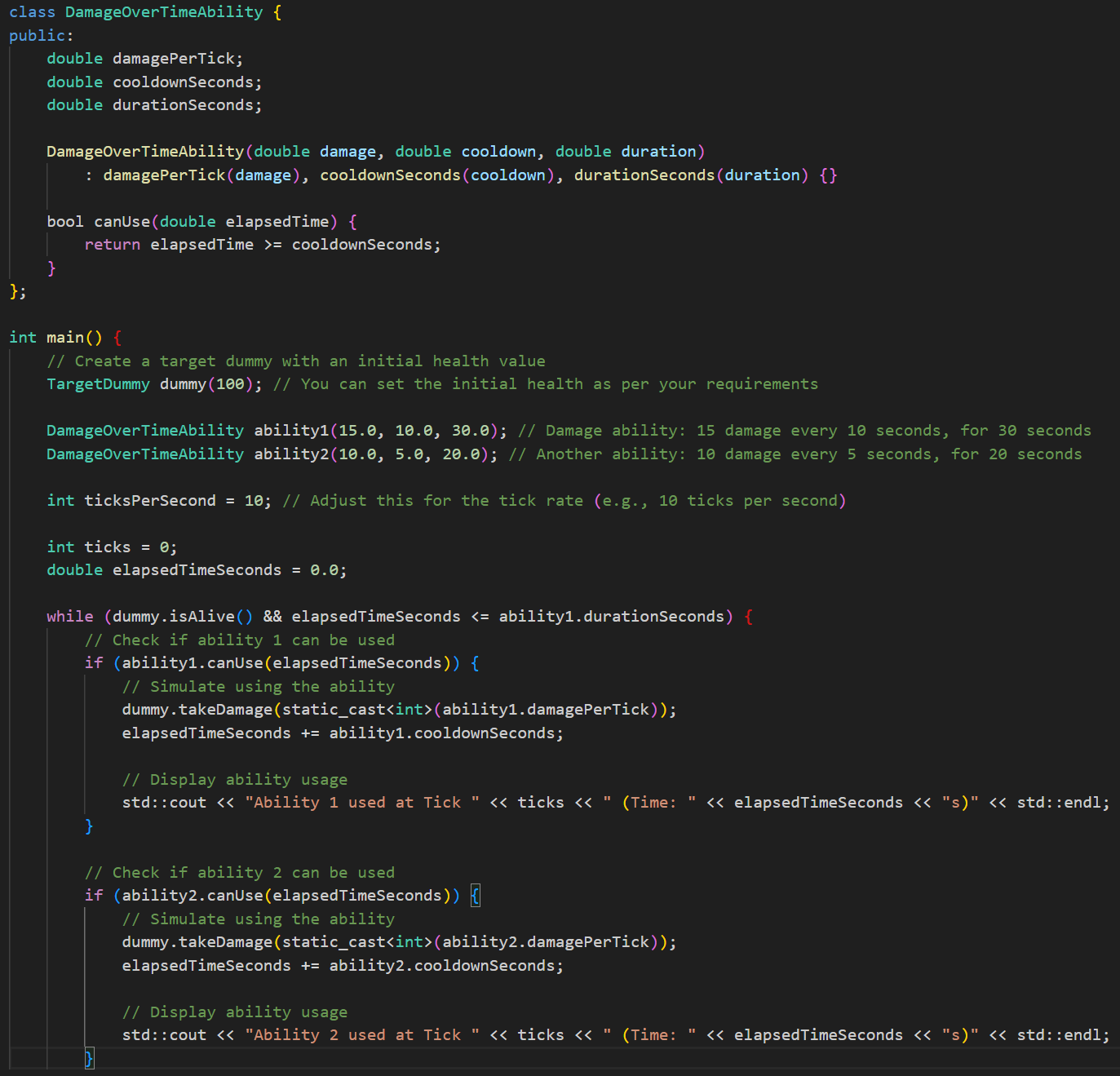 Aaaand we’re back to using wall-clock time. This, I would find out, would be a recurring theme throughout this project. Upon requesting \ wall-clock time not be used, ChatGPT made it calculate time based on the number of ticks…but it also left in a line that had the loop sleep on\ each iteration. I also noticed that it had, at some point, reintroduced the mismatched parentheses error on the random number generator line \ (another recurring theme). So it fixed both issues, and I requested that it make the number of ticks in a second a variable instead of a \ hard-coded value, so that it could be easily changed. It did so, and back came the sleeping on each iteration of the loop. Fixed that, and I \ figured it was time for something a little more in-depth. I asked ChatGPT to implement an ability that would, upon being used, deal (x) damage \ every (y) seconds, for a total duration of (z) seconds. Important code: