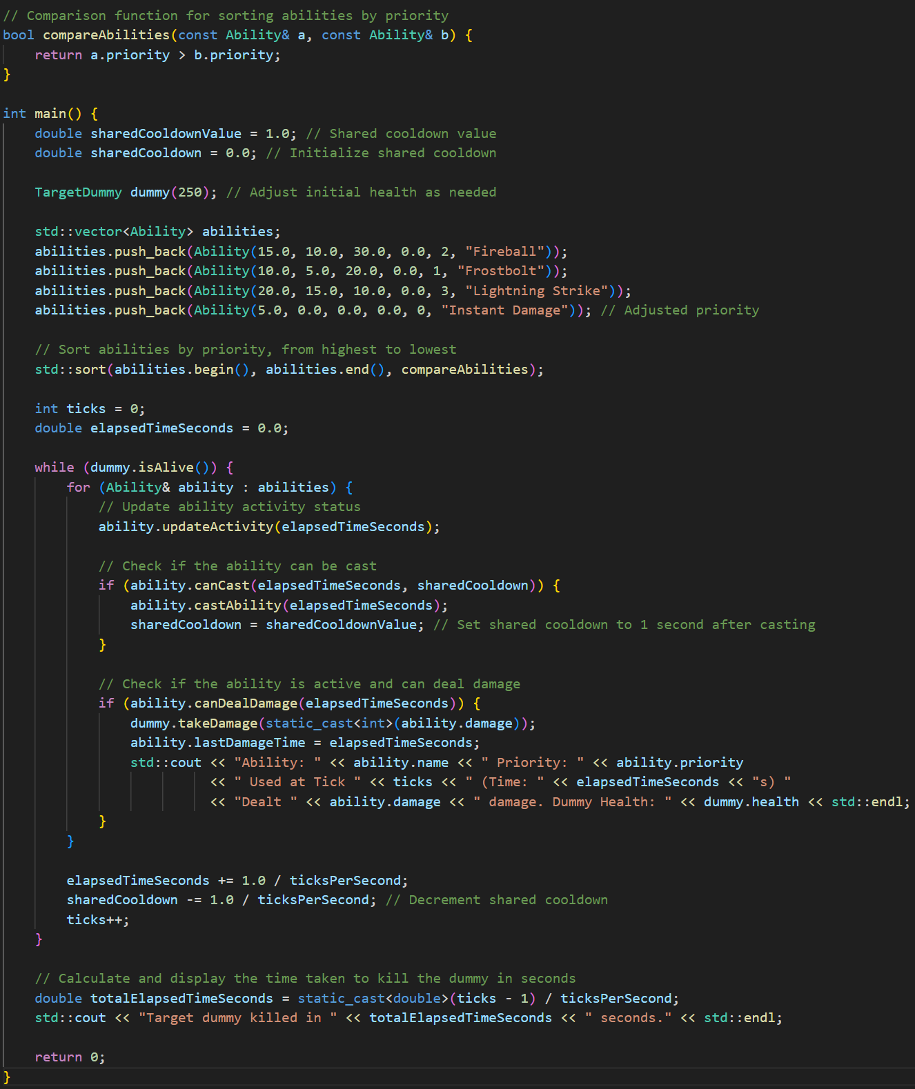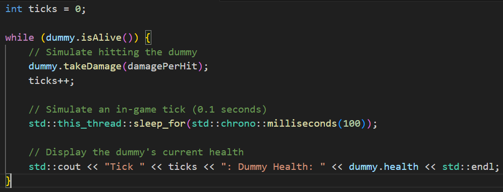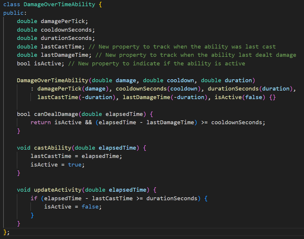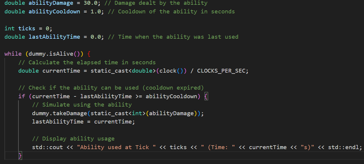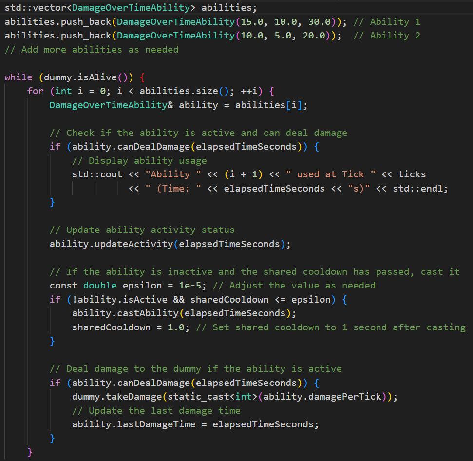 Aaaand we’re back to using wall-clock time. This, I would find out, would be a recurring theme throughout this project. Upon requesting \ wall-clock time not be used, ChatGPT made it calculate time based on the number of ticks…but it also left in a line that had the loop sleep on\ each iteration. I also noticed that it had, at some point, reintroduced the mismatched parentheses error on the random number generator line \ (another recurring theme). So it fixed both issues, and I requested that it make the number of ticks in a second a variable instead of a \ hard-coded value, so that it could be easily changed. It did so, and back came the sleeping on each iteration of the loop. Fixed that, and I \ figured it was time for something a little more in-depth. I asked ChatGPT to implement an ability that would, upon being used, deal (x) damage \ every (y) seconds, for a total duration of (z) seconds. Important code: