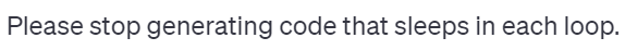 This actually worked, and I did not see another sleep_for call for the rest of the project. This was about the point when I really had to start \ going back-and-forth with ChatGPT to fix the issues in the code. I was still trying not to tell it what code to write, and after a handful of \ exchanges, I made my first suggestion to to the AI: