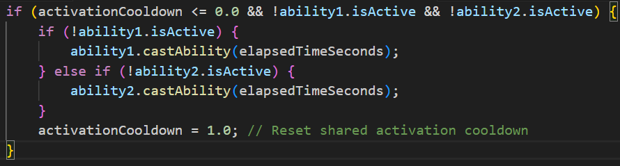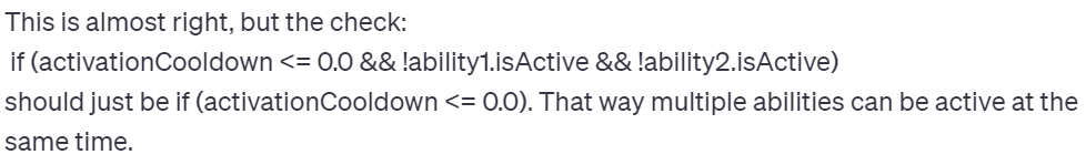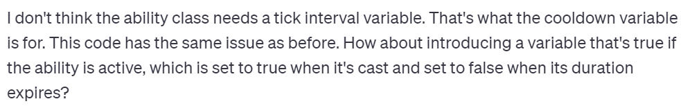 The next step I figured wouldn’t be too bad - in a real game, you wouldn’t be able to cast two abilities at the same time, so I asked ChatGPT to \ make it so that only one ability could be cast at a time, and after an ability was cast, the loop would have to wait for one second before casting \ another ability. The results were…not great. It changed the ability class, giving each ability a member variable which limited that specific \ ability to being cast no more than once every second - an individual cooldown: