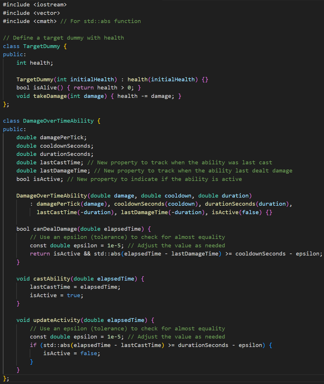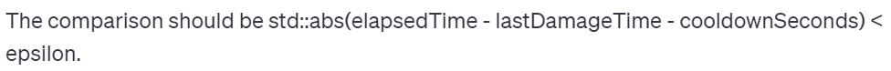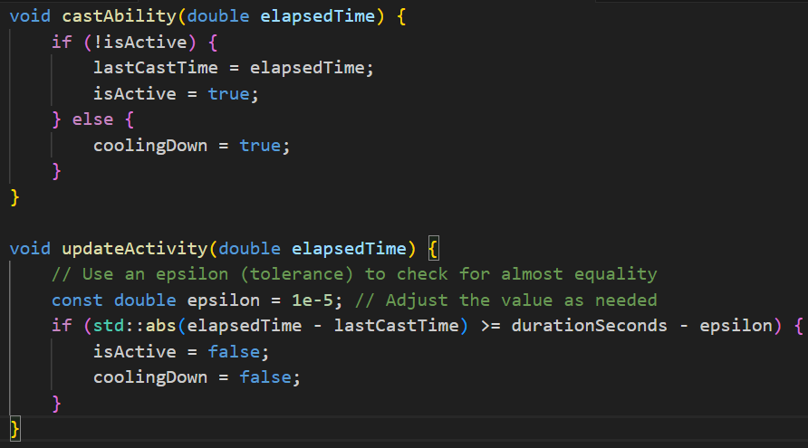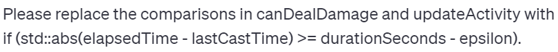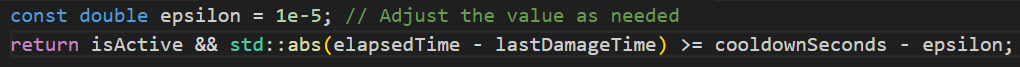 The next issue I had to solve was that comparing doubles in the canDealDamage and updateActivity functions was prone to floating point errors. So \ I asked ChatGPT to fix this issue by doing the comparison using an epsilon. An epsilon, for those who have never had the absolute pleasure of \ dealing with floating point errors, is a small number that basically amounts to a tolerance for inequality. It’s a number that says, if you’re \ not exactly equal, but within “this” close of being equal, then that’s acceptable, you count as being equal. So this is what ChatGPT gave me: