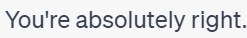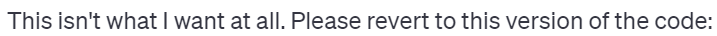 And it made the change I requested. This would be the bane of my existence for the rest of the project. I tested the new code, and promptly \ realized I had made a mistake, and ChatGPT’s code was correct. I asked it to revert the change, and it happily agreed, and spat back out the \ same code with my error in it. I told it that it was right and I was wrong, and it agreed, and gave me the same incorrect code. Finally I \ resorted to straight-up telling it the exact code to use: