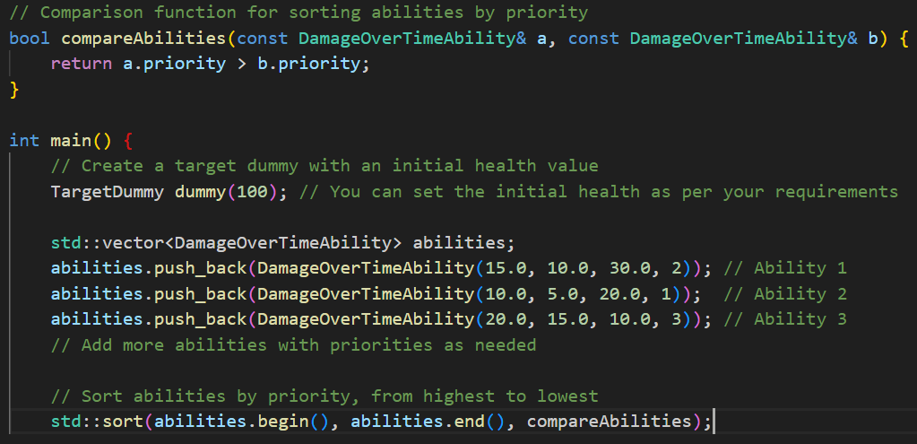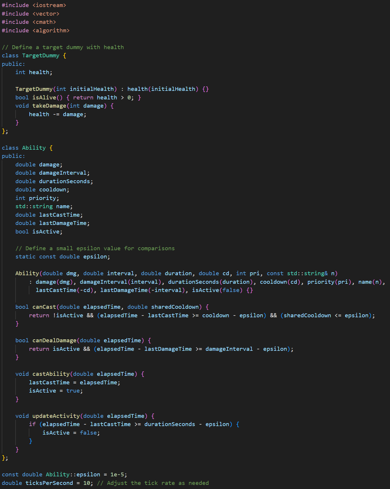 I was quite happy with what ChatGPT gave me here; it worked flawlessly…other than breaking the epsilon comparisons again. I had it fix those again, \ and then I requested that each ability be given a priority, and for it to iterate over the abilities based on highest priority. Pertinent code: