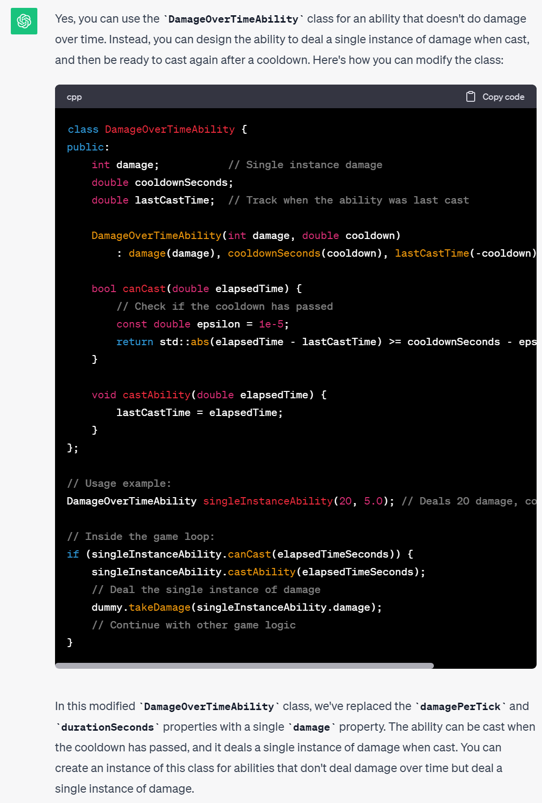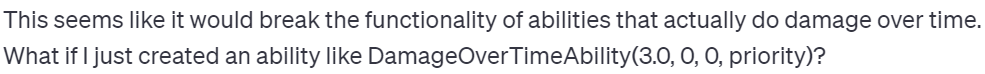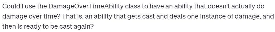 Now I already knew that the answer was yes. The original specification for the damage over time ability was (x) damage, every (y) seconds, for a \ total of (z) seconds. The code we had created worked such that when an ability was cast it immediately dealt damage, so it would be a simple matter \ of having an ability where y and z were set to 0. But what would ChatGPT’s answer be? Well: