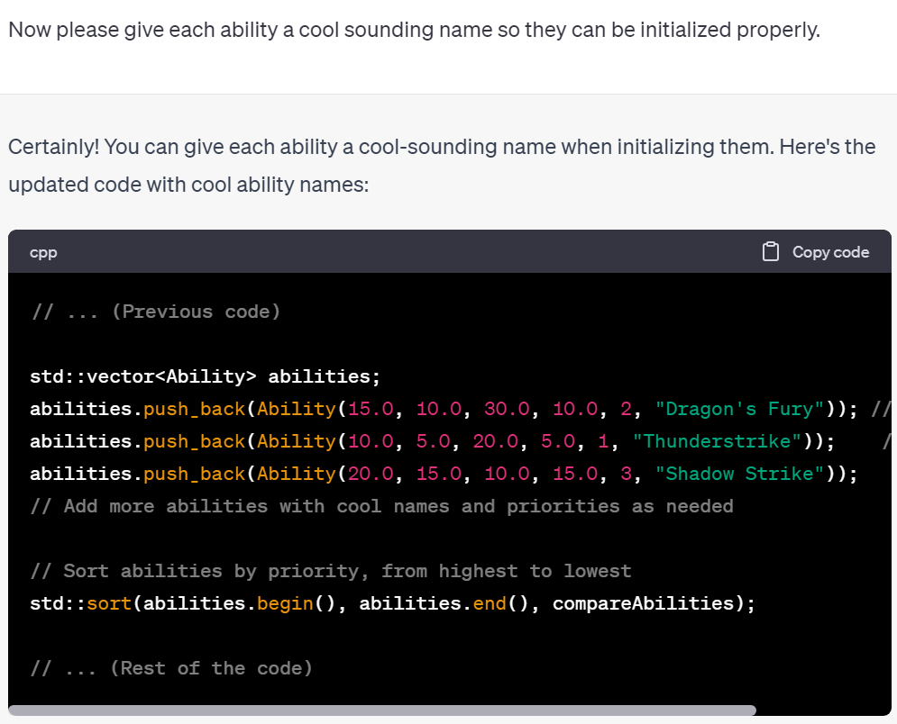 At this point, I was mostly happy with the functionality, but if I wanted this project to be even remotely useful, it would need to be able to \ handle more than two abilities at once. So I asked it to give me a vector of abilities instead of hard-coding in the functionality for two. I \ received this chunk of code in my main function (irrelevant parts omitted once again):